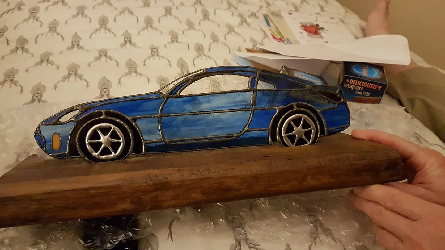 “My son has loved cars almost since the day he was born. His last birthday a few days ago was his 35th - imagine my delight when I saw the incredible art that Vaughan creates in glass which included classic cars. My son was both inspired and ecstatic to receive a totally unique version of a Chevy '57 crafted in glass and mounted a plinth of wood that was over 300 years old: a treasure for life. As this was a birthday during the Coronavirus lockdown, Vaughan also giftwrapped and posted it for me. A complete service that made my son's day: thank you so much. You are a very talented man.”